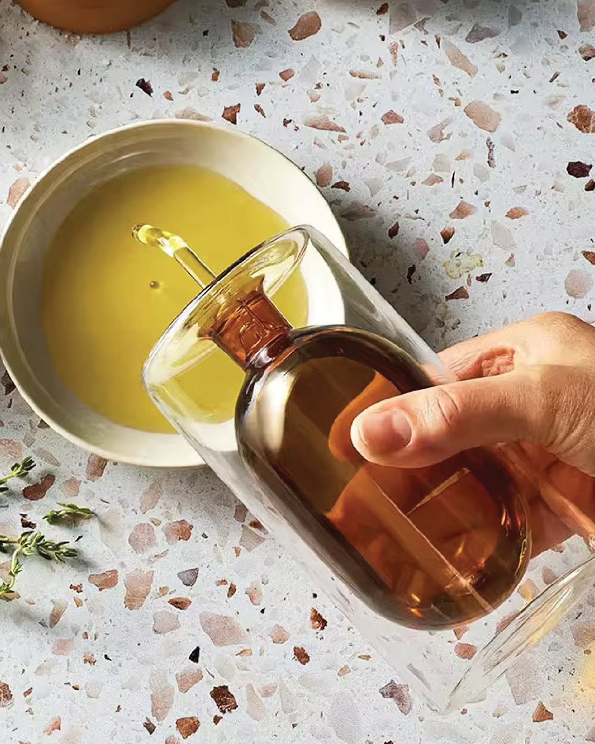 Crafted from high-quality transparent glass, its unique double-walled design not only looks stunning but also keeps your oil or vinegar protected and fresh. The slim spout ensures a smooth, precise pour every time — perfect for drizzling over salads, pasta, or bread.